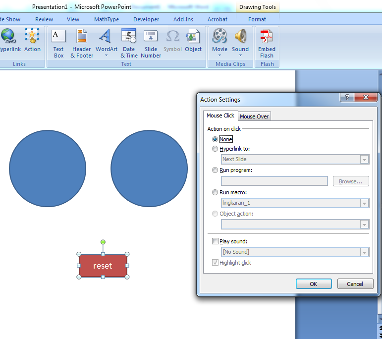 Langkah ke tiga : untuk menjalankan script VBA, lakukan secara berturut-turut insert > shapes > run macro , prosedut lingkaran_1 untuk Oval 1, prosedur lingkaran_2 untuk Oval 2 dan prosedur reset untuk action button : custom 3