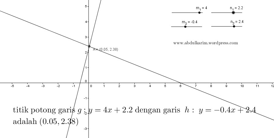 3. Atur slider sehingga m_1 tidak sama dengan m_2, kemudian tentukan titik potongnya, dan pada object properties setting untuk show label pilih name & value. Kemudian pada tab “advanced” – condition to show ketikkan m_1<>m_2
