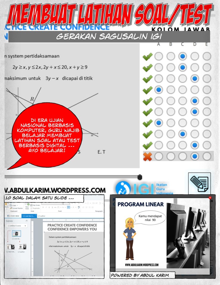 Ketika siswa mengerjakan ujian nasional di hadapan komputer, apa yang sebaiknya dilakukan guru dalam membuat materi persiapan UNBK? Salah satunya adalah guru belajar membuat bahan ajar berbasis komputer, sudah saatnya guru menyajikan materi pelajaran, latihan atau test dalam format digital. Agar siswa lebih mudah mengakses bahan-bahan pelajaran di sekolah di manapun, kapanpun dengan perangkat yang mereka miliki. Ayo Guru belajar!