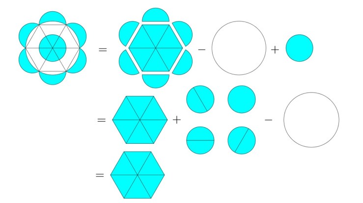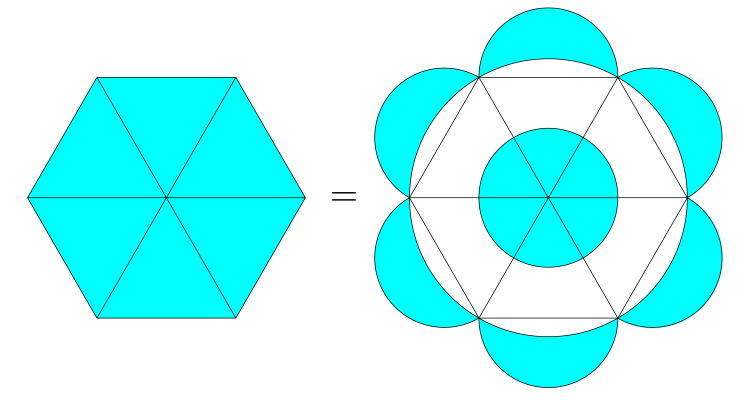 Untuk membuktikan masalah ini, kita gunakan fakta (yang diperkenalkan oleh Hipocrates) bahwa luas daerah lingkaran sesuai dengan proporsi kuadrat jari-jarinya sehingga empat lingkaran kecil berwarna biru, luas daerahnya sama dengan lingkaran besar berwarna putih.